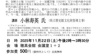 この度、北信及び東信の主要博物館を巡り、いま話題を集めている「安曇野展」や最新の発掘情報に触れることができる研修会を企画しました。個々人では見学できない場所や、研究者の解説付きの見学もありますので、この機会にぜひご参加ください。見学先のサイ...